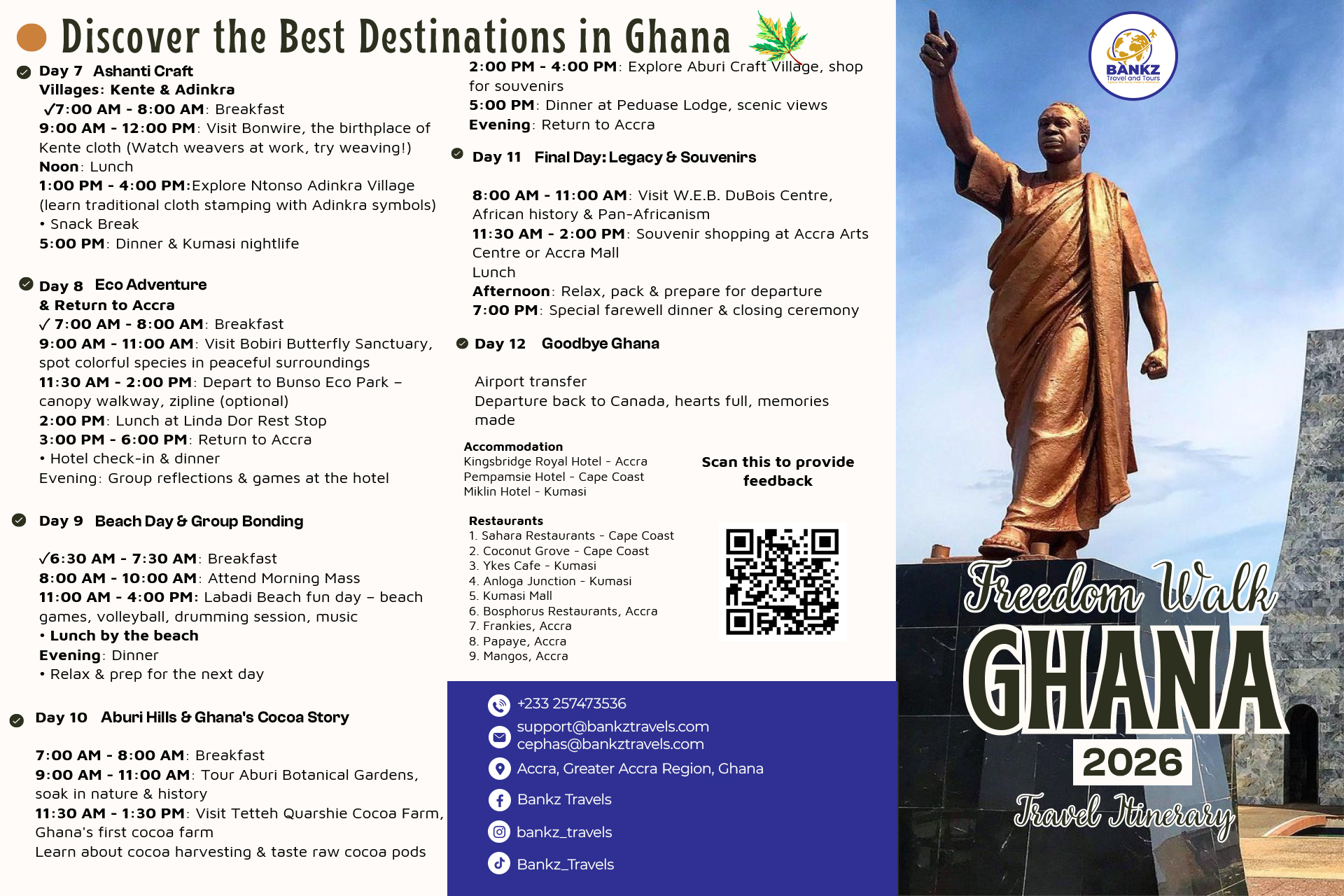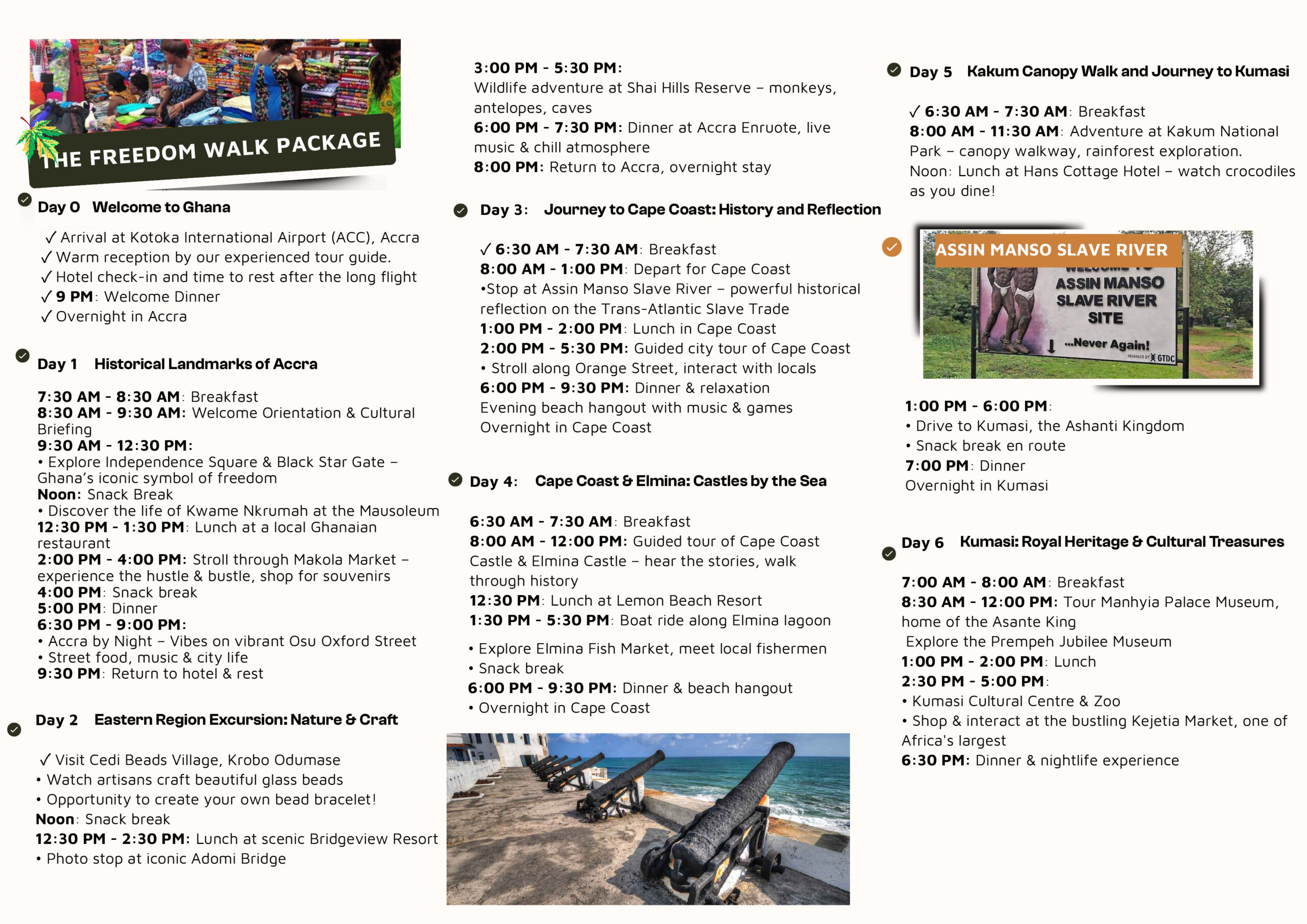 Freedom walks packages in Ghana primarily focus on Independence or Emancipation, offering 9–12 day historical, cultural, and educational tours. Packages often include guided tours of Accra’s Independence Square, Cape Coast/Elmina Slave Castles, Assin Manso Slave River, Kakum National Park etc.